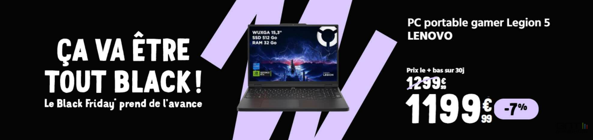 - PC portable gaming Lenovo Legion 5 15IRX10 à 1 199 € soit -7% (15,3" IPS WUXGA 165Hz, Dolby Vision, G-SYNC, 100% sRGB, Core i7-13650HX, RTX 5070 115W, RAM 32 Go DDR5, SSD 512 Go, sans Windows, WiFi 6, Bluetooth 5.2)