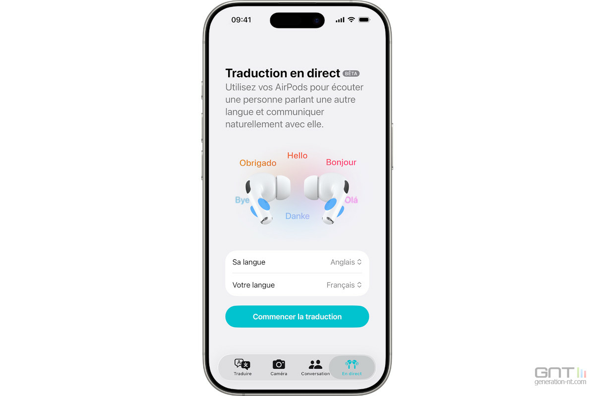 Ces écouteurs doivent être associés à un iPhone compatible avec Apple Intelligence, ce qui implique un iPhone 15 Pro ou un modèle ultérieur, et avec iOS 26. C'est Apple Intelligence qui se charge du traitement.