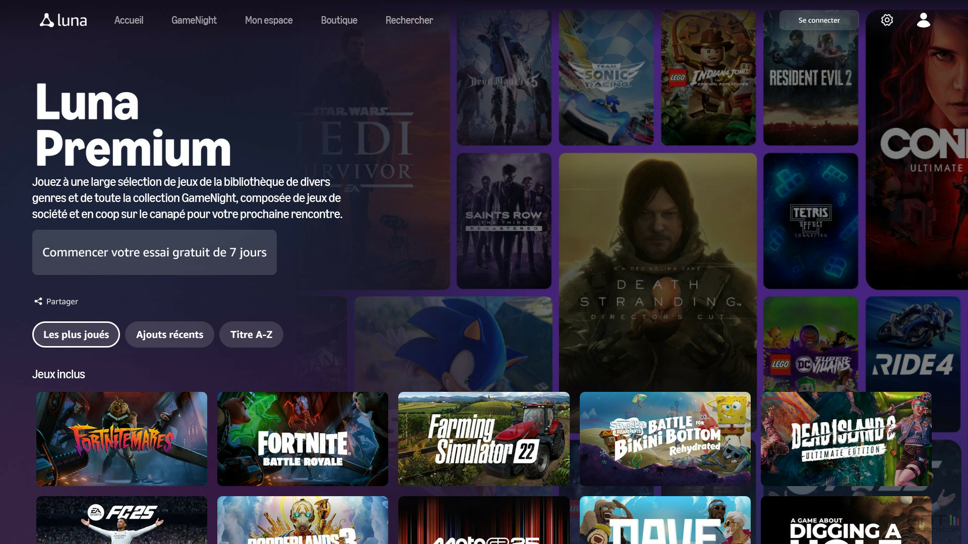 Luna Premium inclut tout ce qui est disponible dans l'offre Prime, mais ajoute l'accès à une bibliothèque étendue comprenant des titres tels que EA SPORTS FC 25, Star Wars Jedi: Survivor et Batman: Arkham Knight.