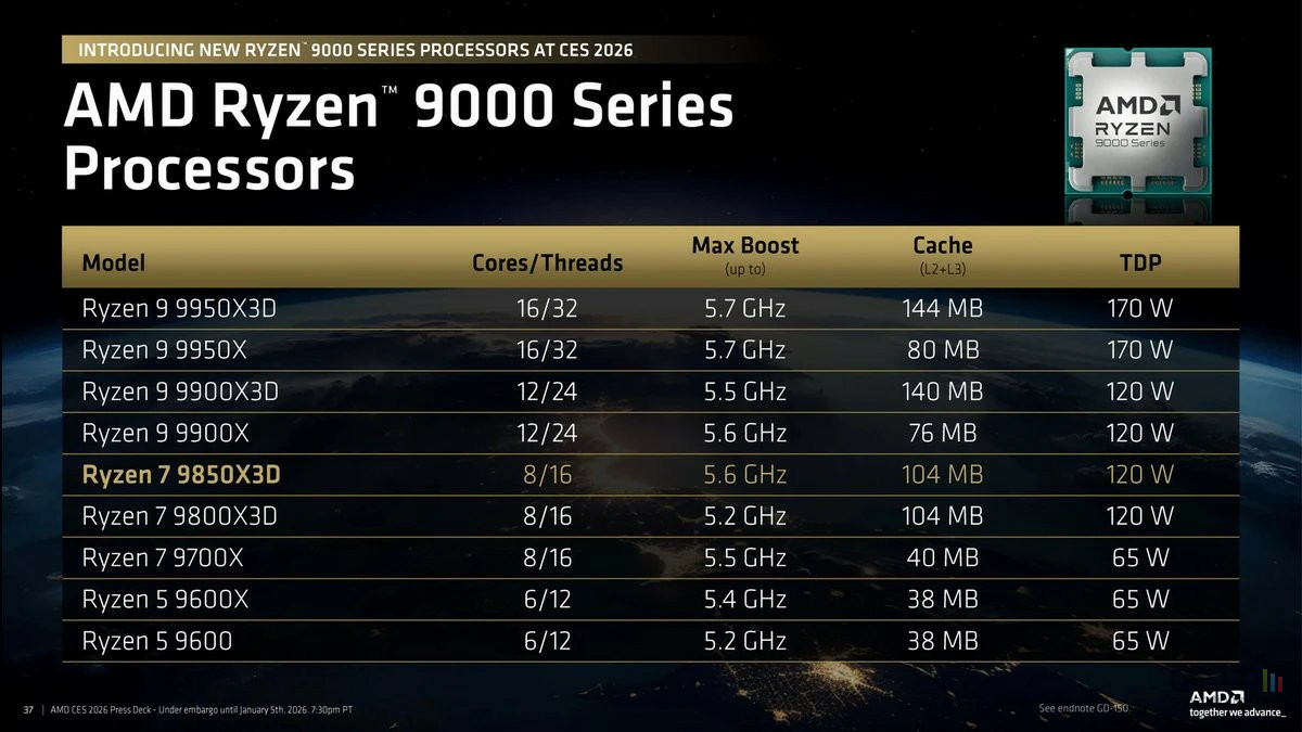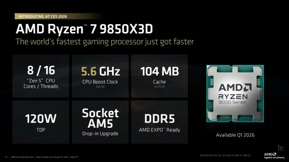 AMD a profité du CES 2026 pour officialiser une puce qui n'était plus un secret pour personne : le Ryzen 7 9850X3D. Présenté comme le processeur ultime pour le jeu vidéo, ce nouveau modèle est en réalité une optimisation ciblée de son prédécesseur, le très populaire 9800X3D.