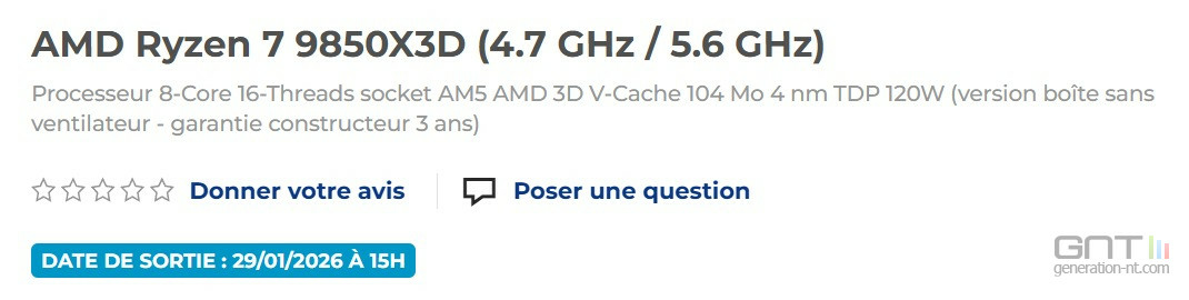 AMD est resté vague, évoquant une sortie au cours du premier trimestre 2026 sans préciser de date ni de tarif. Mais c'était sans compter sur une indiscrétion d'un acteur majeur en France. Le revendeur LDLC a mis à jour sa fiche produit en affichant une date de sortie très précise : le 29 janvier 2026 à 15h. Une information non officielle mais crédible.
