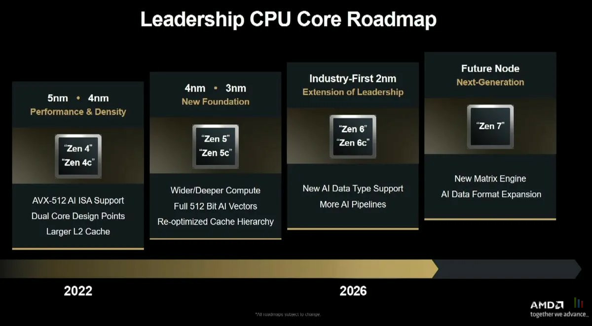 Si la fuite MLID reste une rumeur (très crédible), AMD a aussi parlé. Lors de ses résultats financiers, la firme a confirmé sa feuille de route officielle. Zen 6 est bien prévu pour 2026 (en 2nm) et Zen 7 arrivera "dans les deux années qui suivent" (donc 2027-2028), ce qui corrobore le timing de la fuite.