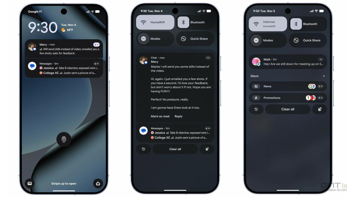 Pour la gestion des notifications, la mise à jour d'Android 16 introduit des résumés de notifications alimentés par l'IA, capables de condenser de longs messages ou des discussions de groupe pour en offrir un aperçu rapide. Google précise un traitement des données en local sur l'appareil.