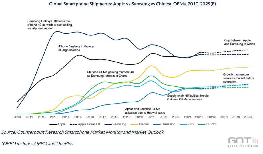 Un changement de leadership se profile à l'horizon. Selon les prévisions du cabinet d'analyse, Apple est en passe de devenir le premier constructeur mondial de smartphones en termes de livraisons annuelles en 2025, une position que Samsung occupait sans interruption depuis 2011.