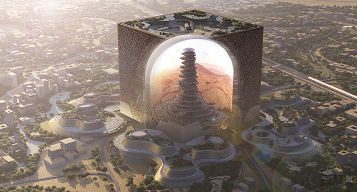 Annoncé en février 2023, le projet Mukaab devait être la pièce maîtresse du nouveau centre-ville de Riyad (Arabie Saoudite), baptisé New Murabba. Cette structure colossale, un cube de 400 mètres de hauteur, de largeur et de longueur, devait abriter un dôme interne projetant des images holographiques grâce à l'intelligence artificielle, créant des « mondes immersifs » pour les visiteurs.