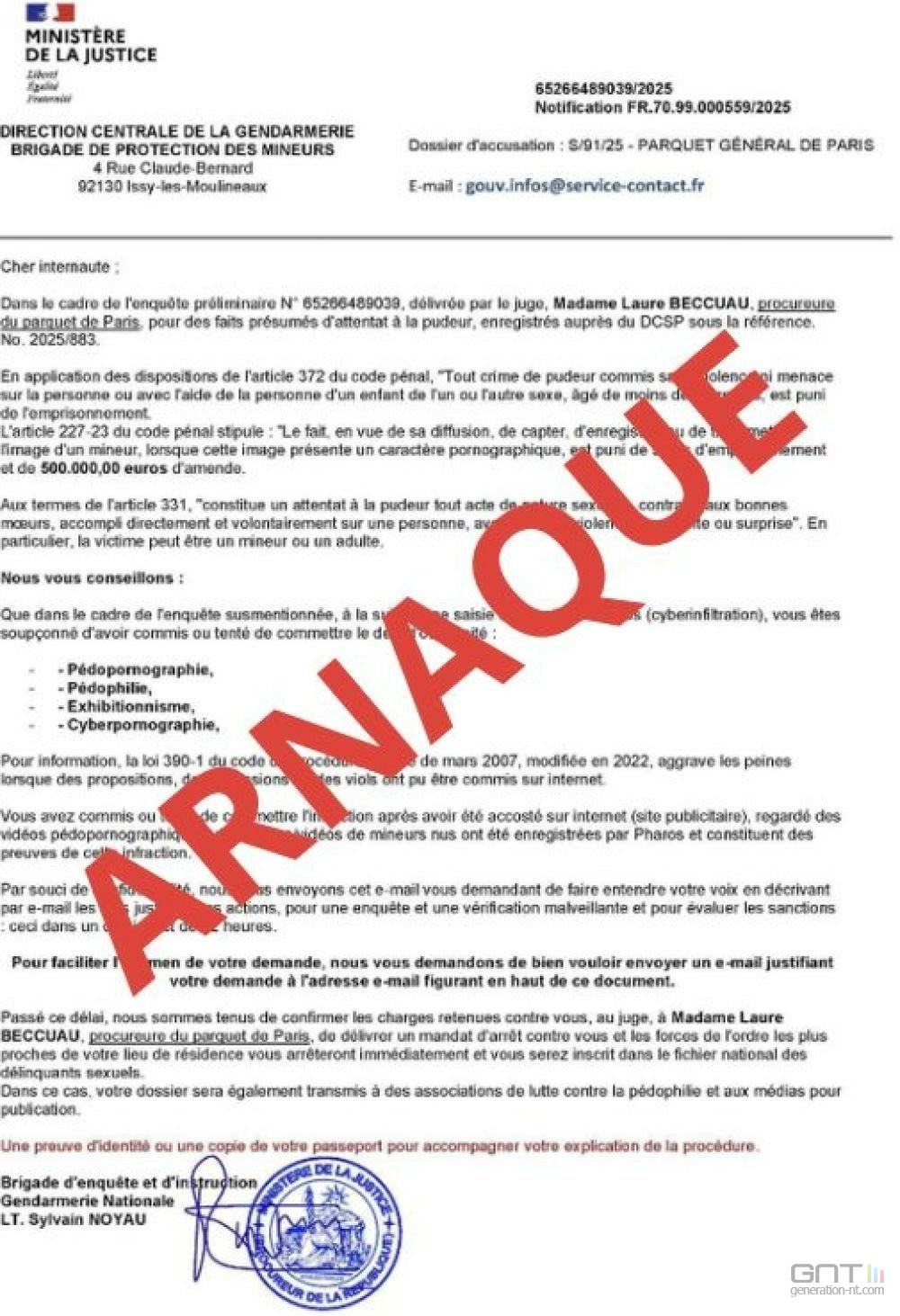Un email à l'apparence très officielle atterrit dans votre boîte de réception dont l'en-tête mentionne la "Direction centrale de la gendarmerie" et la "Brigade de Protection des Mineurs". Le contenu, lui, fait froid dans le dos : vous seriez accusé de pédopornographie, d'exhibitionnisme ou d'autres crimes sexuels.