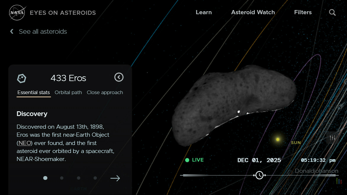 Découvert en 1898 par l'astronome allemand Gustav Witt, (433) Éros est le tout premier astéroïde géocroiseur à avoir été identifié. Il a également été le sujet d'une mission spatiale pionnière de la Nasa.