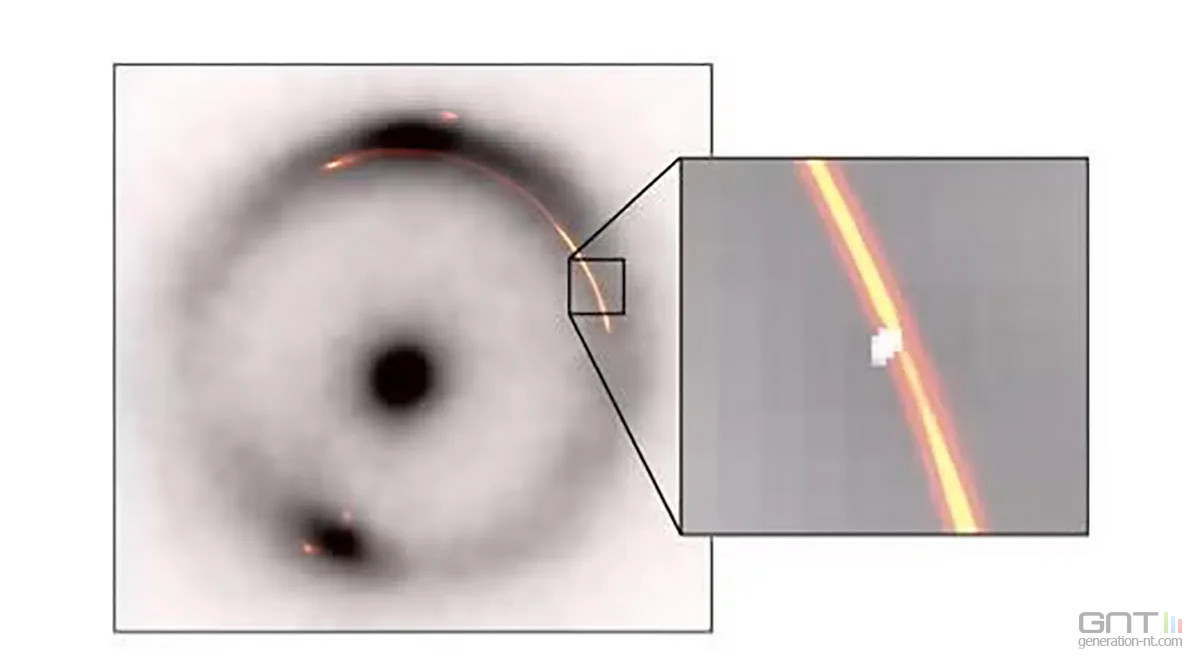 Les chercheurs étudiaient un anneau d'Einstein, l'image déformée d'une galaxie lointaine, lorsqu'ils ont remarqué une entaille anormale dans l'arc lumineux. Selon John McKean, qui a dirigé la collecte des données, " uniquement un autre petit amas de masse pouvait provoquer cela ".