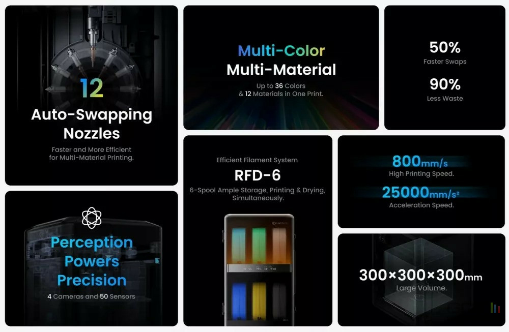 La machine est aussi truffée de technologie : plus de 50 capteurs internes et quatre caméras assistées par IA surveillent le processus en temps réel pour détecter les défauts et automatiser la calibration. Le système peut être connecté à six boîtiers de séchage RFD-6, portant la capacité totale à 36 bobines de filament, bien que seules 12 puissent être actives simultanément via les buses.