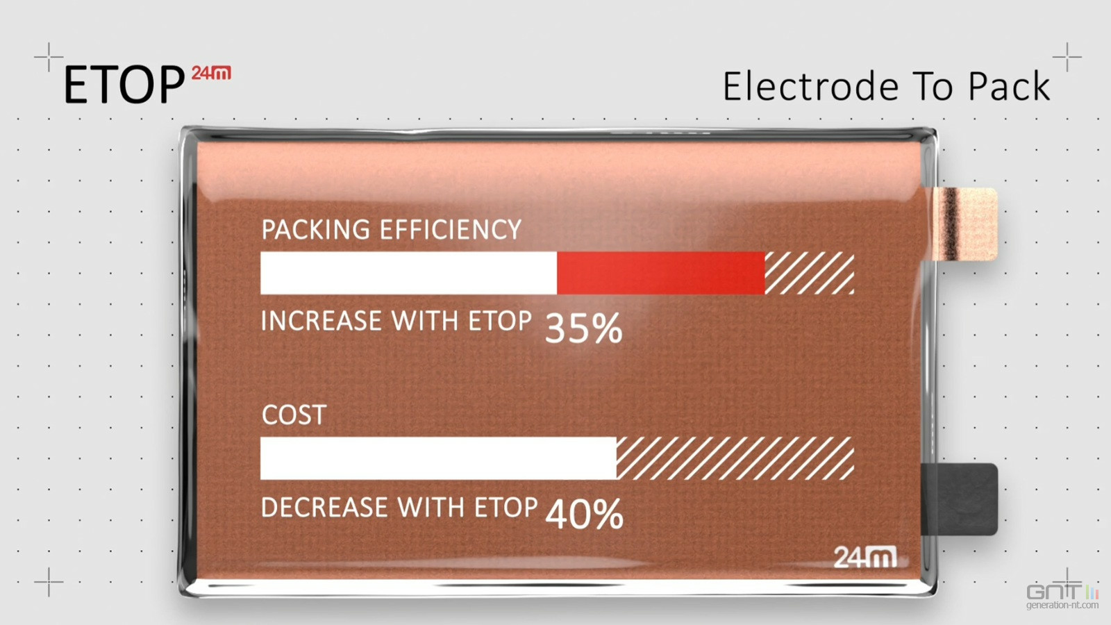 La société 24M Technologies, basée dans le Massachusetts, propose de limiter les contenants encombrants. Son approche, baptisée ETOP pour « Electrode-to-Pack », est d'une simplicité désarmante.