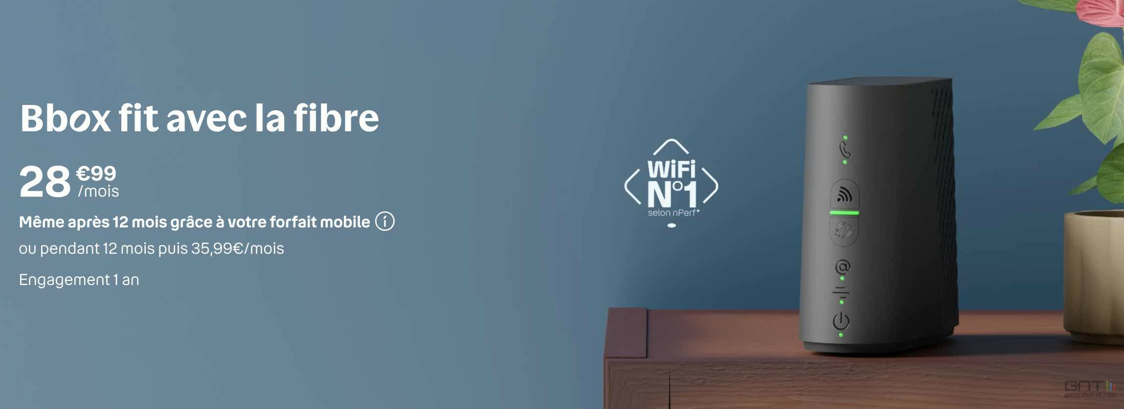 ➡️ Bbox fit : 28,99 €/mois. Le prix est garanti fixe si vous avez déjà un forfait mobile Bouygues. Sinon, le prix grimpe à 35,99 € après un an. Elle nécessite un engagement de 12 mois.