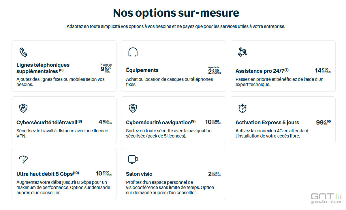 D'autres options de sécurité comprennent la Navigation sécurisée (10 € HT/mois pour 5 utilisateurs) et le VPN Nomade.
