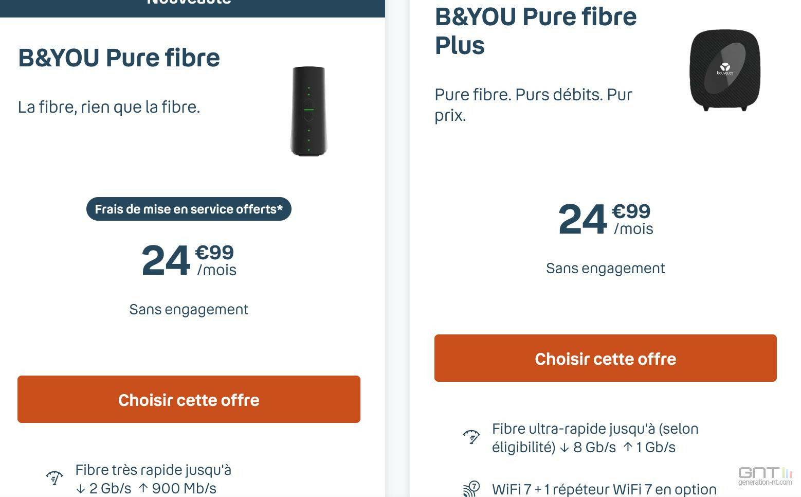 Bouygues Telecom a lancé discrètement une nouvelle version encore plus rapide de la B&YOU Pure fibre, la B&YOU Pure fibre Plus, qui multiplie par quatre les capacités de téléchargement de l'offre standard et qui est en plus proposée au même prix que sa grande sœur : 24,99 €/mois.