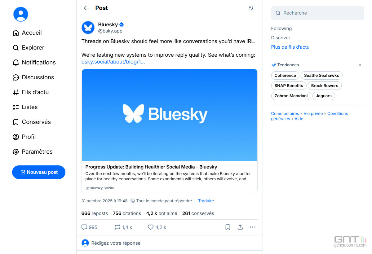Le réseau social Bluesky officialise le cap des 40 millions d'utilisateurs. La base d'utilisateurs a doublé en un an, dans un contexte de défiance vis-à-vis de X (ex-Twitter). Une croissance qui s'accompagne de nouveautés pour les outils de conversation.