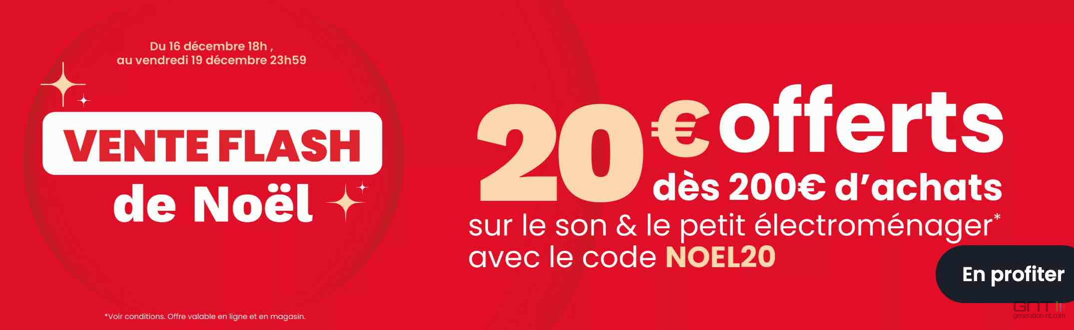 C'est au tour du son et du petit électroménager d'être mis au-devant de la scène chez Boulanger : jusqu'à vendredi 19 décembre inclus, profitez d'une remise de 20 € dès 200 € d'achat dans ces deux rayons avec le code NOEL20.