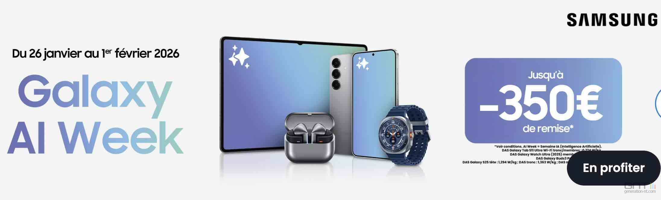 Jusqu'au 1er février, Boulanger lance sa Galaxy AI Week. Cette semaine spéciale est l'occasion idéale pour s'équiper des derniers produits de la marque (smartphones, tablettes, montres et PC) dotés de Galaxy AI, tout en bénéficiant de réductions significatives et d'avantages exclusifs comme le bonus rachat.
