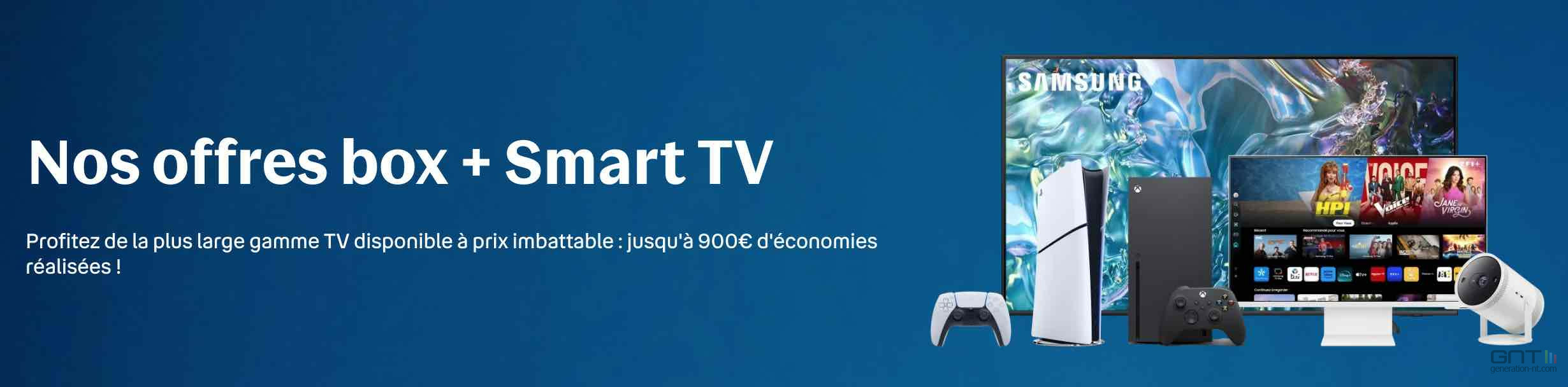 En ce moment, Bouygues Telecom propose une offre très intéressante dans ses packs box + Smart TV : grâce à la souscription d'une Bbox must ou ultym, vous pouvez obtenir une Smart TV Samsung à seulement 49 € au lieu de 329 €. Une économie colossale de 280 € pour un écran 4K qui intègre directement l'application B.tv+.
