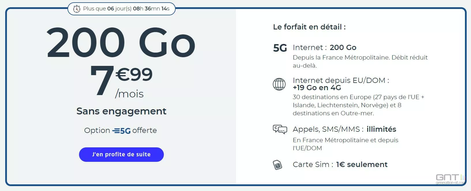 Ce forfait mobile intègre donc 200 Go de données mobiles 5G avec débit réduit au-delà, 19 Go de data 4G en Europe et outre-mer, et bien entendu les appels, SMS et MMS illimités en France métropolitaine et depuis l'UE/DOM. Et le tout est sans engagement et avec la carte sim à seulement 1 €, bref cela ne se refuse pas !