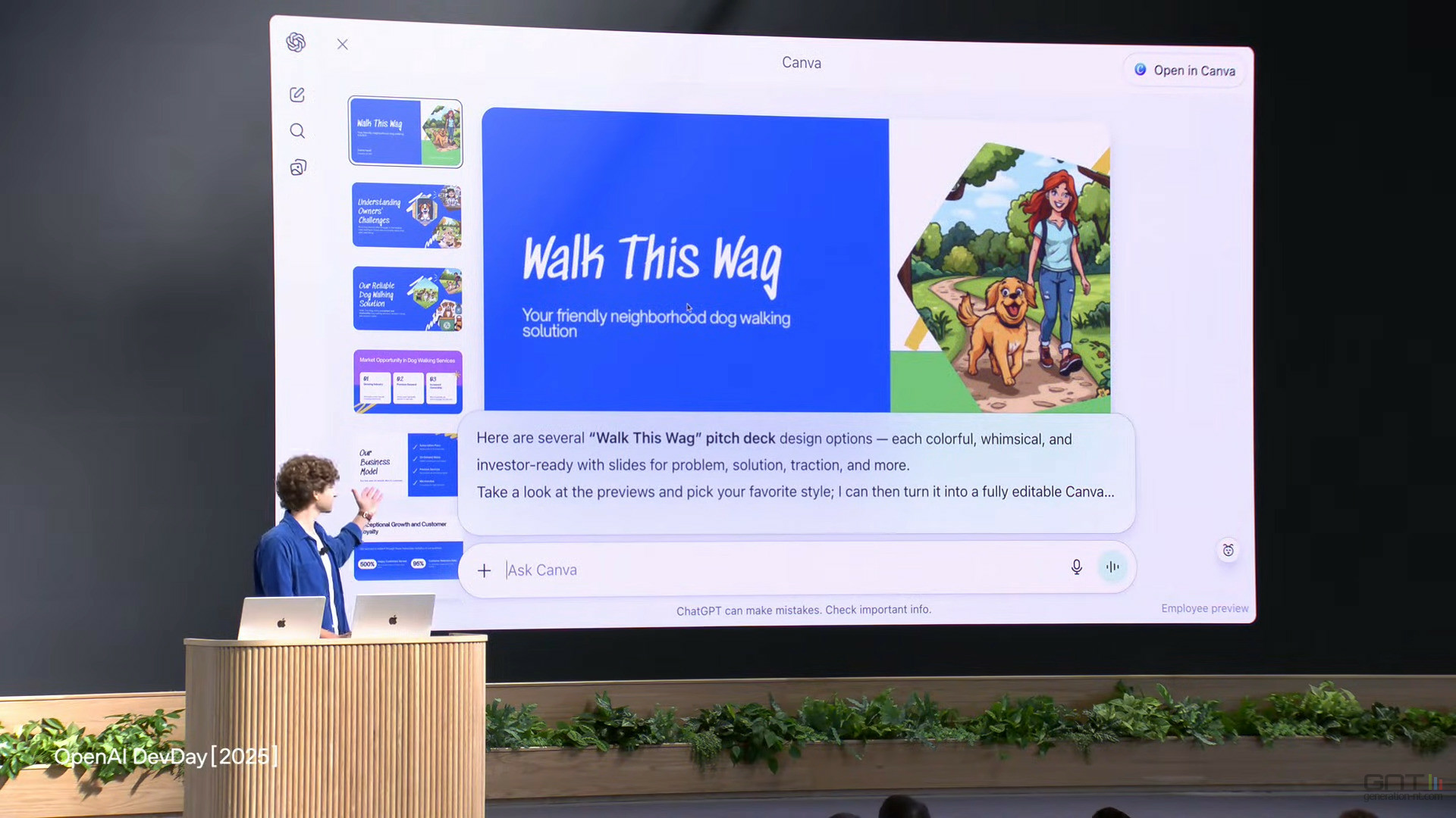 Une demande à Canva pour créer un poster peut être suivie d'une requête pour transformer ce visuel en une présentation complète. Patron d'OpenAI, Sam Altman a qualifié cette avancée de " nouvelle génération d'applications qui sont interactives, adaptatives et personnalisées, avec lesquelles vous pouvez discuter ".