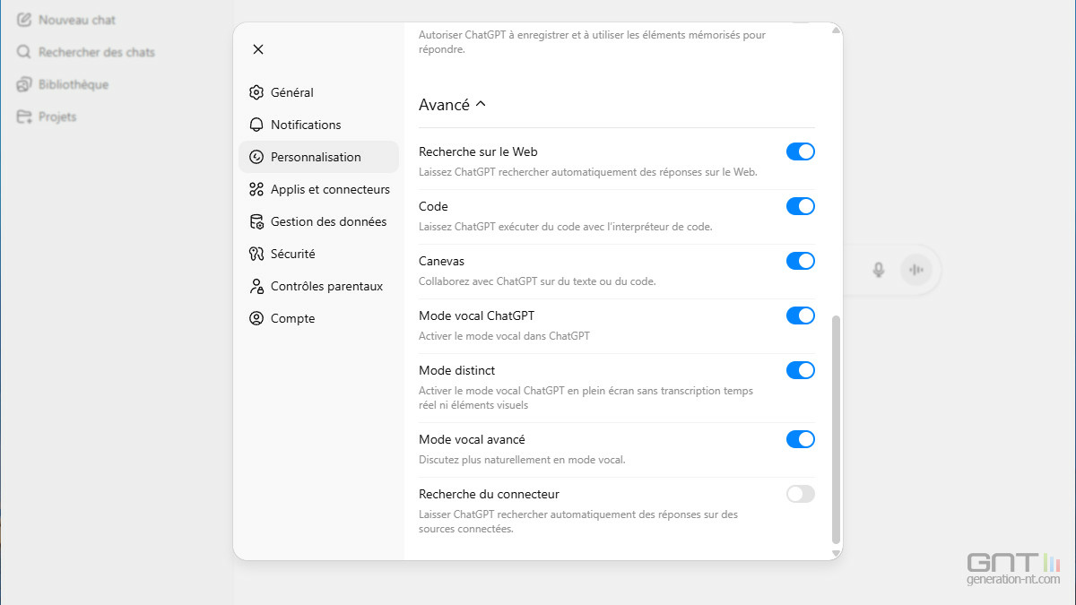 Le cas échéant, il suffit de se rendre dans les paramètres de ChatGPT, Personnalisation et Avancé. Sous le Mode vocal ChatGPT, il est proposé l'option Mode distinct : " Activer le mode vocal ChatGPT en plein écran sans transcription en temps réel ni éléments visuels. "