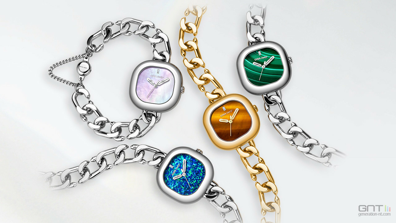 - Matériaux et détails de haute qualité : la collection présente des cadrans en nacre, des accents contrôlés par le jeu de la lumière – lorsque la pierre et la lumière se combinent, leur éclat devient un atout visuel.