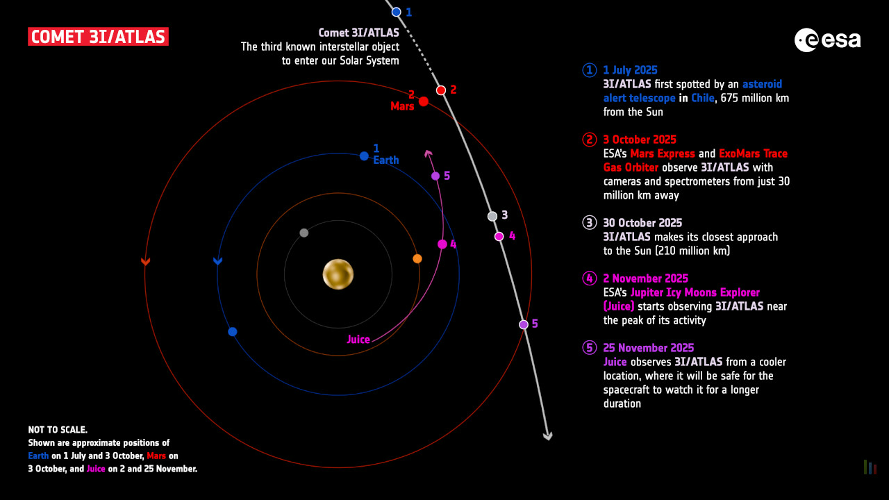 Entre le 1er et le 7 octobre, l'Agence spatiale européenne (ESA) a mobilisé deux de ses orbiteurs martiens, ExoMars TGO et Mars Express, pour observer le passage de la comète 3I/ATLAS.