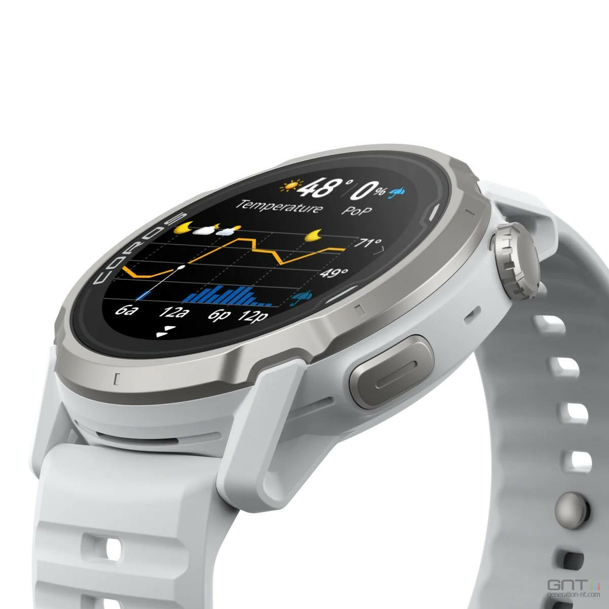 Mais les vraies nouveautés sont à l'intérieur. La montre embarque désormais un microphone et un haut-parleur, permettant de prendre des appels directement depuis son poignet. La fameuse couronne de navigation, signature de Coros, a été déplacée pour éviter les appuis accidentels. Côté capteurs, l'arsenal est complet : cardiofréquencemètre, oxymètre de pouls, altimètre barométrique et même un électrocardiogramme (ECG).
