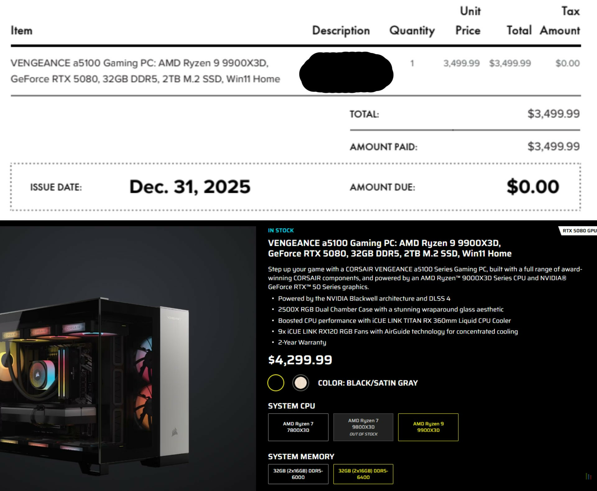 Le premier incident a été déclenché par un client ayant commandé un PC Corsair Vengeance A5100 pour 3 499 dollars. La commande a été confirmée, facture à l'appui. Pourtant, peu de temps après, l'acheteur reçoit un email l'informant de l'annulation de son achat, sans aucune justification. Le plus troublant survient lorsqu'il tente de repasser commande : le même ordinateur est alors affiché à 4 299 dollars, subissant une brutale augmentation prix de 800 dollars.
