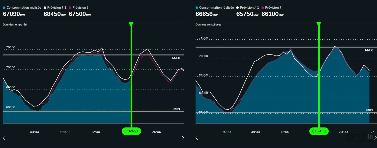 A gauche, consommation électrique en France au 30 décembre 2025, à droite consommation électrique au 30 décembre 2024 (source : RTE)