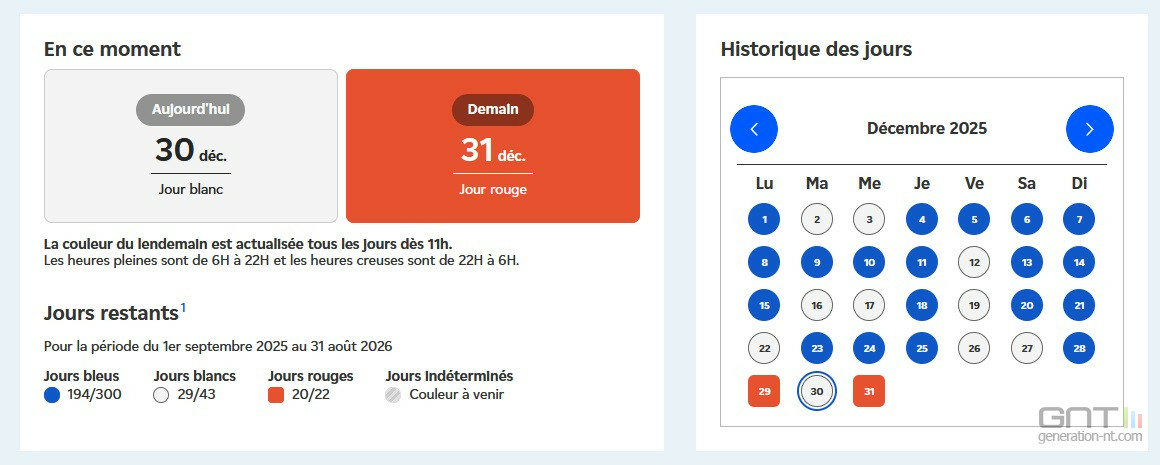 Le calendrier est divisé en jours Bleus (très avantageux), Blancs (intermédiaires) et jours Rouges (extrêmement chers). Ces 22 jours Rouges, concentrés en hiver, visent à inciter les consommateurs à réduire drastiquement leur usage lors des pics de froid.