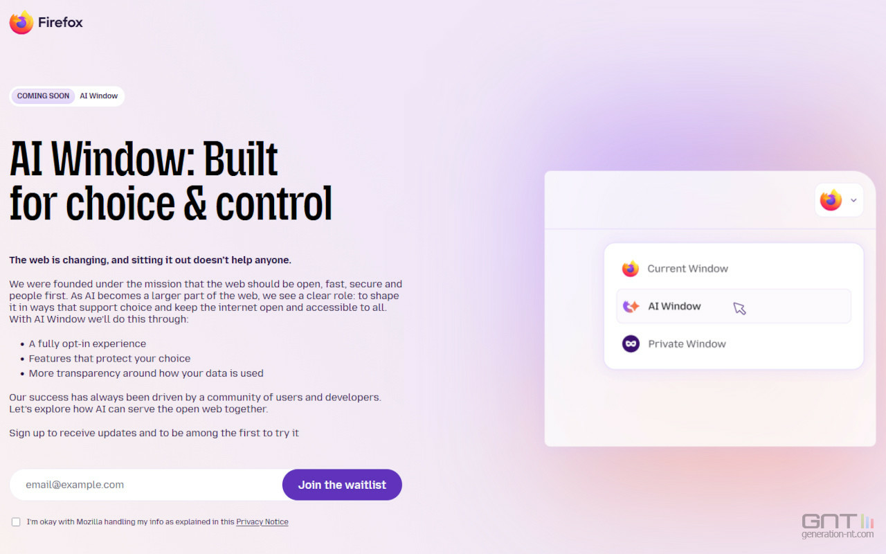 " Dans Firefox, vous ne serez jamais enfermé dans un seul écosystème ou n'aurez jamais l'IA imposée dans votre expérience de navigation. " L'utilisateur décide quand, comment, et même s'il souhaite utiliser ces outils.