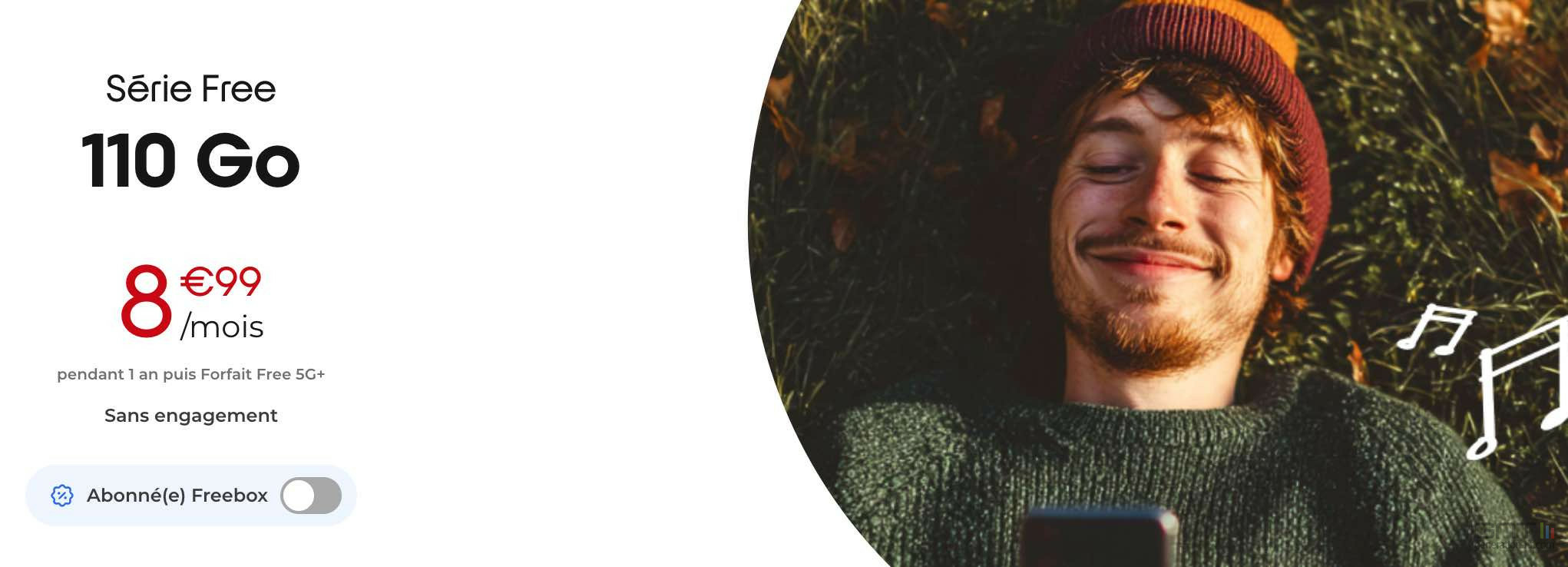 Avec le forfait Série Free 110 Go, vous profitez d'un tarif réduit de 8,99 € par mois pendant les 12 premiers mois. Ce forfait sans engagement inclut :