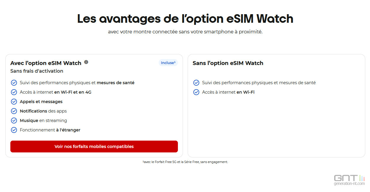 À noter une limitation à la 4G pour l'option eSIM Watch de Free qui est disponible et fonctionne en France métropolitaine, ainsi qu'à l'étranger.