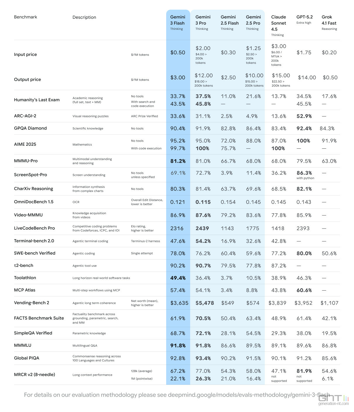Sur le test MMMU-Pro, qui évalue la compréhension multimodale, il obtient un score de 81,2 %, dépassant ainsi GPT-5.2 d'OpenAI (79,5 %) et s'imposant comme une référence sur les tâches visuelles et analytiques. Un point notable est que Gemini 3 Flash est systématiquement bien meilleur que Gemini 2.5 Pro.