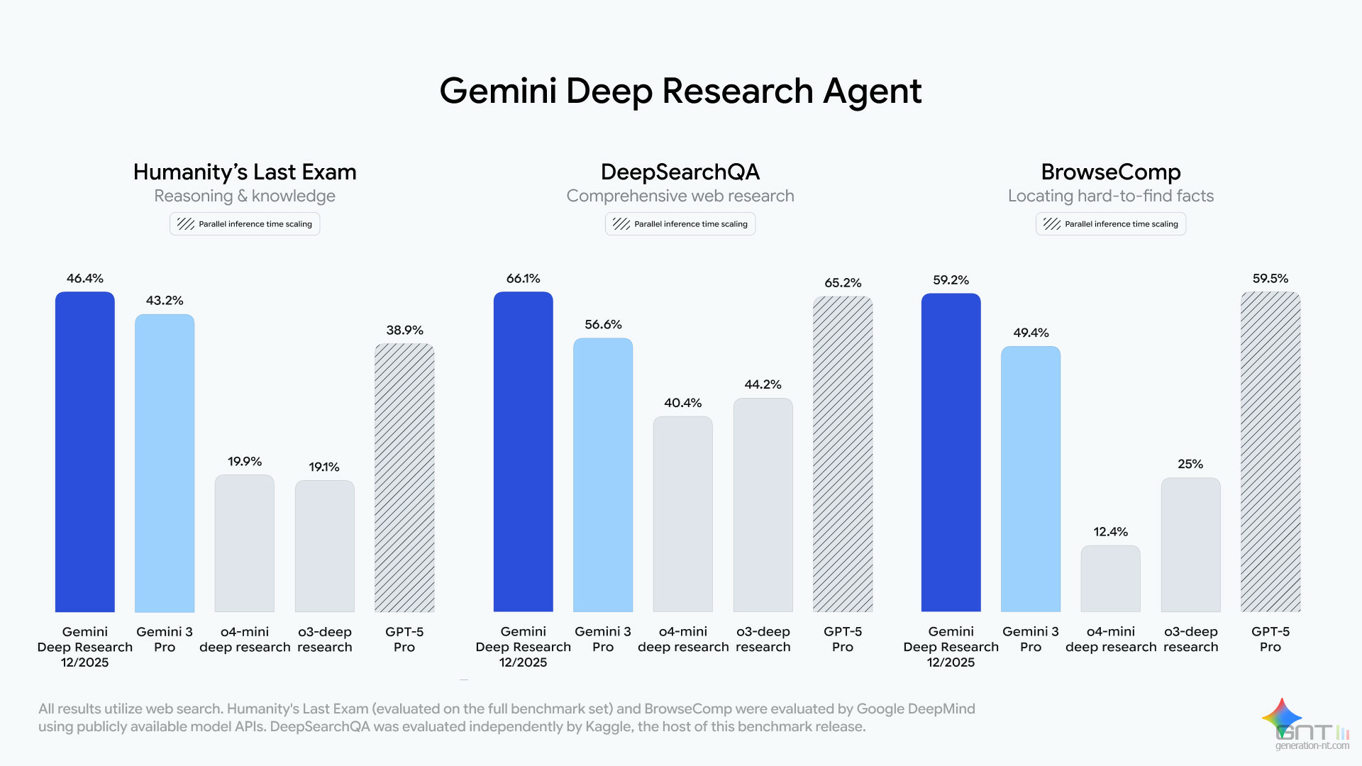 En matière de performance, l'agent IA obtient 46,4 % sur le benchmark Humanity’s Last Exam (HLE), un score de 59,2 % sur BrowseComp, et 66,1 % sur DeepSearchQA. Des résultats qui attestent d'une amélioration par rapport au modèle Gemini 3 Pro seul.