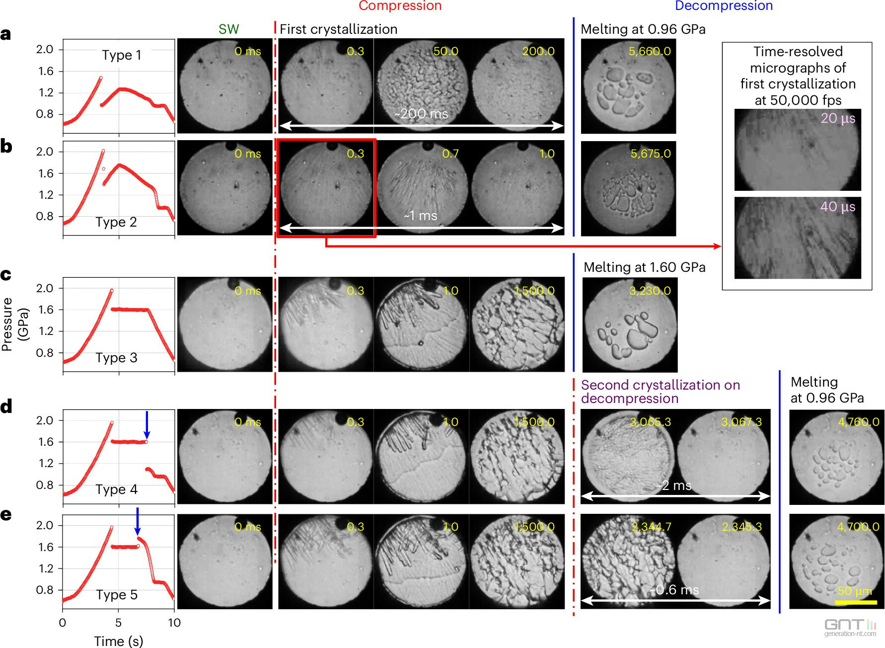 Elles ont permis de "filmer" en temps réel l'agencement des molécules d'eau lors des cycles de compression et de décompression, répétés plus de 1000 fois. Des analyses complémentaires ont ensuite révélé la structure cristalline tétragonale de la glace XXI, composée d'unités de répétition étonnamment grandes.