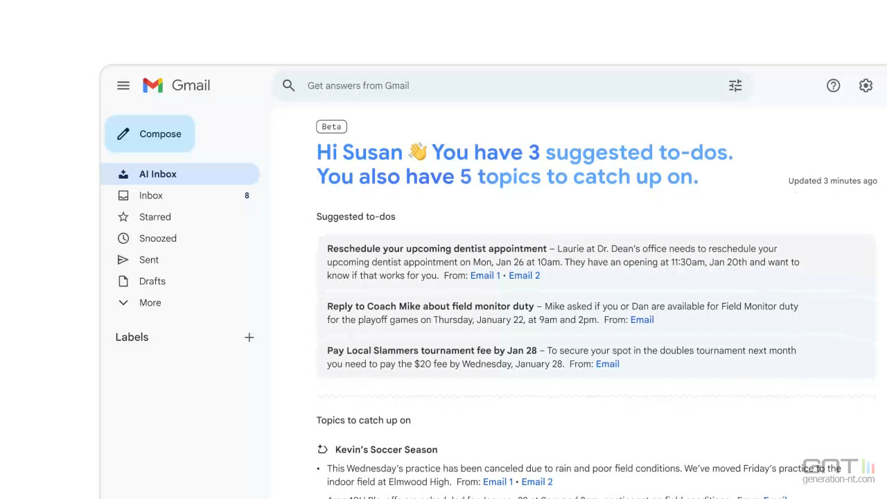 La nouvelle AI Inbox est une refonte de la boîte de réception afin de " filtrer les contenus superflus pour vous permettre de vous concentrer sur ce qui est le plus important ". L'interface est assimilée à un briefing personnalisé qui met en avant les tâches à effectuer et les sujets à suivre.