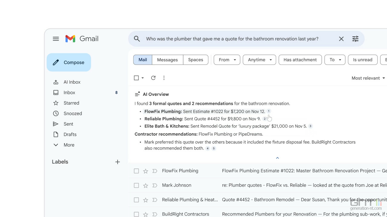 Pour les abonnés Google AI Pro et Ultra, la fonctionnalité va plus loin. Il devient possible de poser des questions directement à sa boîte de réception en langage naturel, comme " Quel est le plombier qui m'a fait un devis l'an dernier ? "