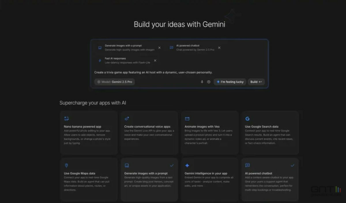 L'IA gère la liaison des API et la configuration. Google a aussi revu sa "Galerie d'applications" pour proposer des codes de démarrage et des aperçus interactifs pour s'inspirer. Un bouton "J'ai de la chance" a même été ajouté pour générer des idées d'apps.