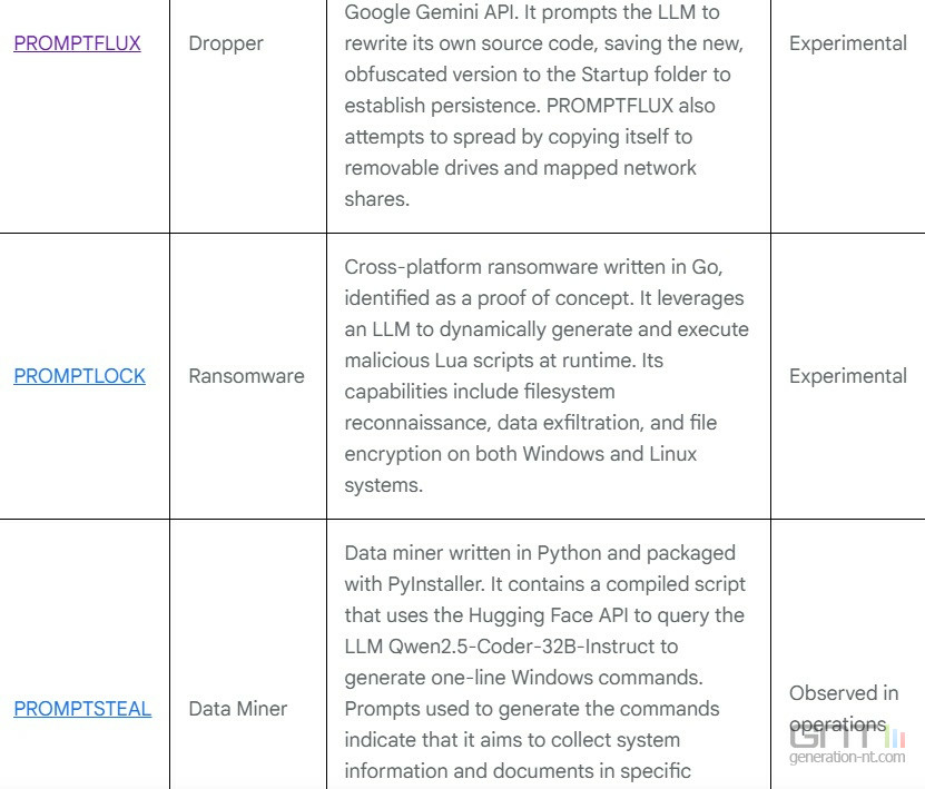 PROMPTFLUX n'est pas un cas isolé. Le rapport du GTIG détaille d'autres familles de malwares qui empruntent la même voie.