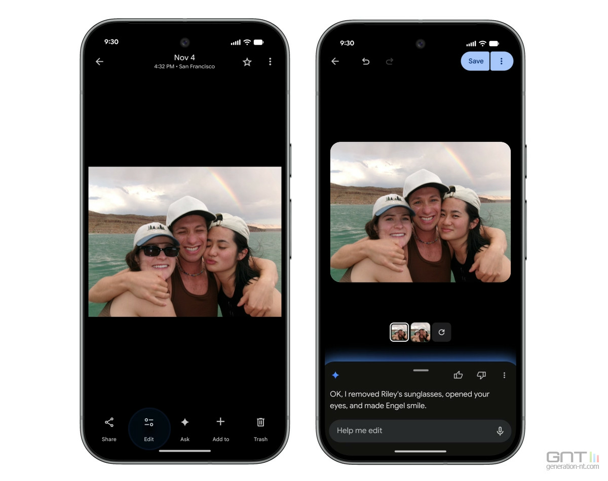 Pour Google Photos et avec l'IA, une aide à la modification et en langage naturel concerne les utilisateurs éligibles aux États-Unis. Des exemples cités sont le retrait de lunettes de soleil et la correction d'un sourire sur des clichés. L'IA utilise d'autres photos de la galerie pour appliquer des modifications personnalisées.