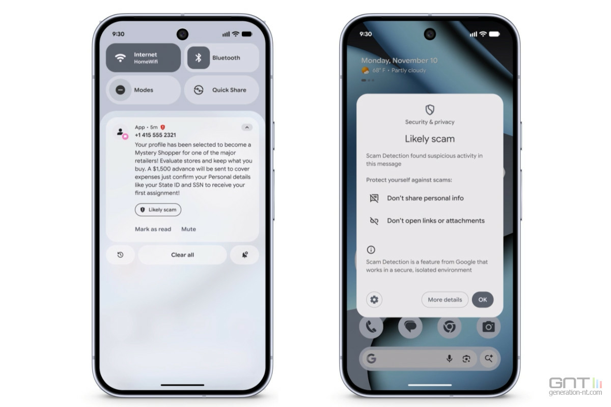 Côté sécurité, la détection d'arnaques, qui analysait déjà les appels dans certains pays, s'étend aux notifications de discussions aux États-Unis, avec une alerte " Escroquerie probable ".