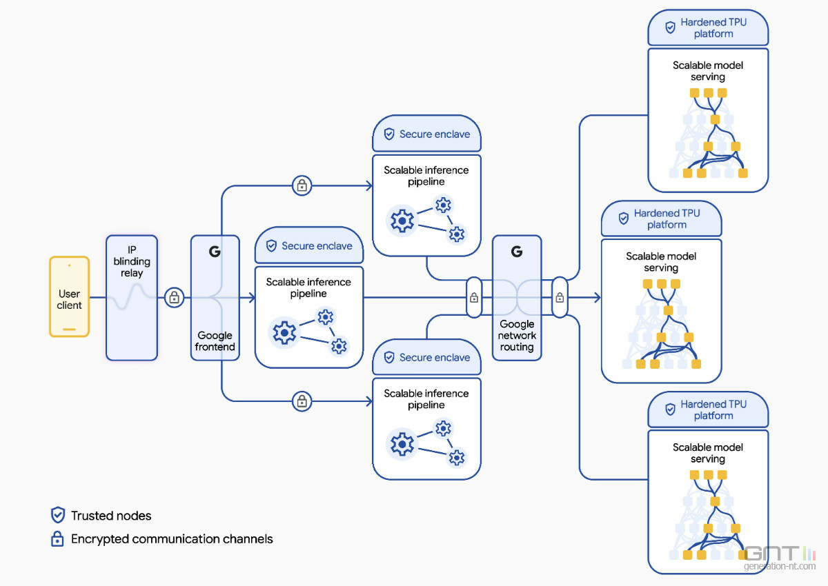 La solution s'appuie sur une pile technologique Google intégrée, utilisant ses propres puces Tensor Processing Units (TPU) et les Titanium Intelligence Enclaves (TIE). Une connexion chiffrée et une attestation à distance lient l'appareil de l'utilisateur à cet environnement cloud.
