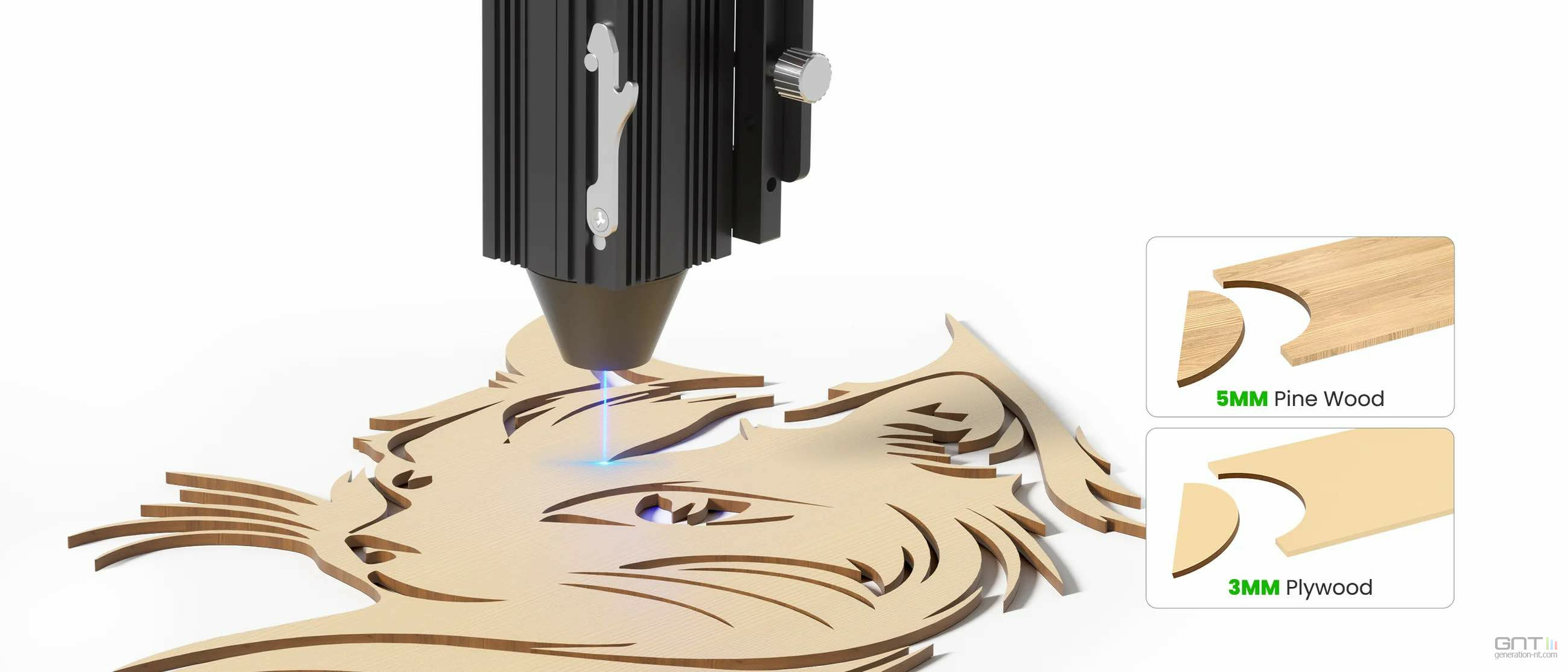 - Gravure et découpe : il peut couper avec aisance du contreplaqué (jusqu'à 3 mm) et du bois de pin (jusqu'à 5 mm).