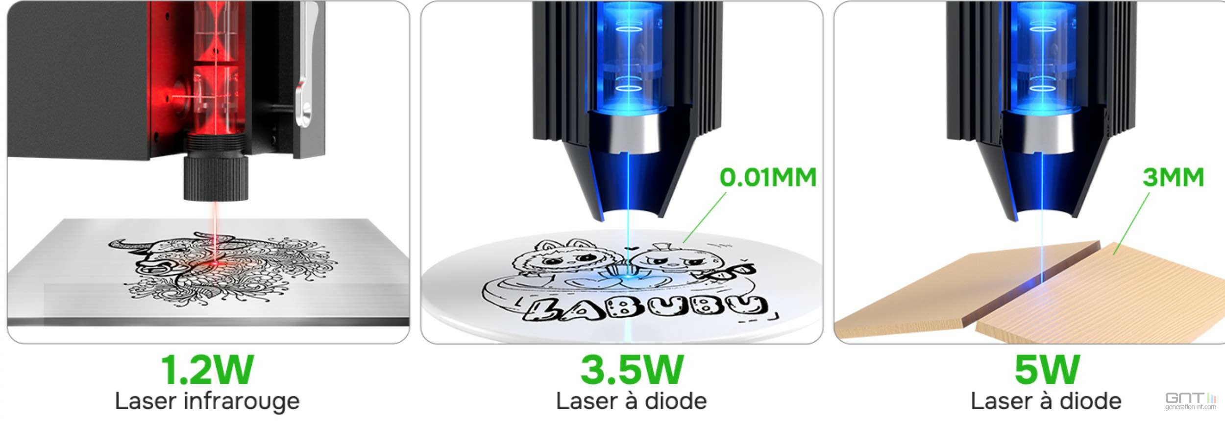 - Gravure sur métal : grâce au module infrarouge optionnel (1,2 W).