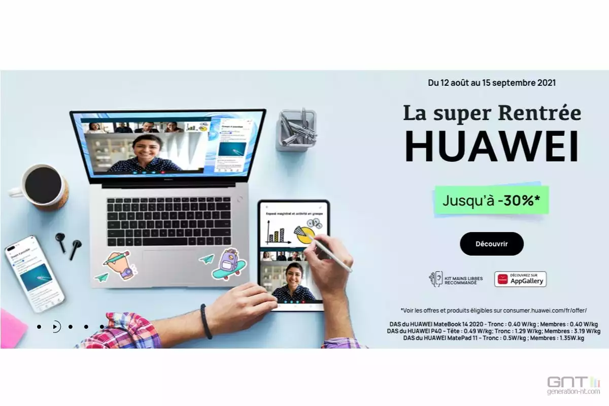 Jusqu'au 15 septembre 2021, la marque Huawei fait sa rentrée. Directement depuis son site internet officiel, elle propose plein de promotions sur une bonne partie de sa gamme :