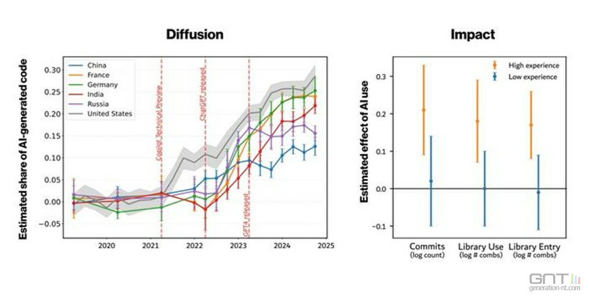 Pourtant, l'analyse ne montre pour eux aucun gain de productivité statistiquement significatif. À l'inverse, les développeurs expérimentés, qui y ont recours plus modérément (27 % de leur code), sont les seuls à générer les gains de productivité globaux mesurés à 3,6 %.