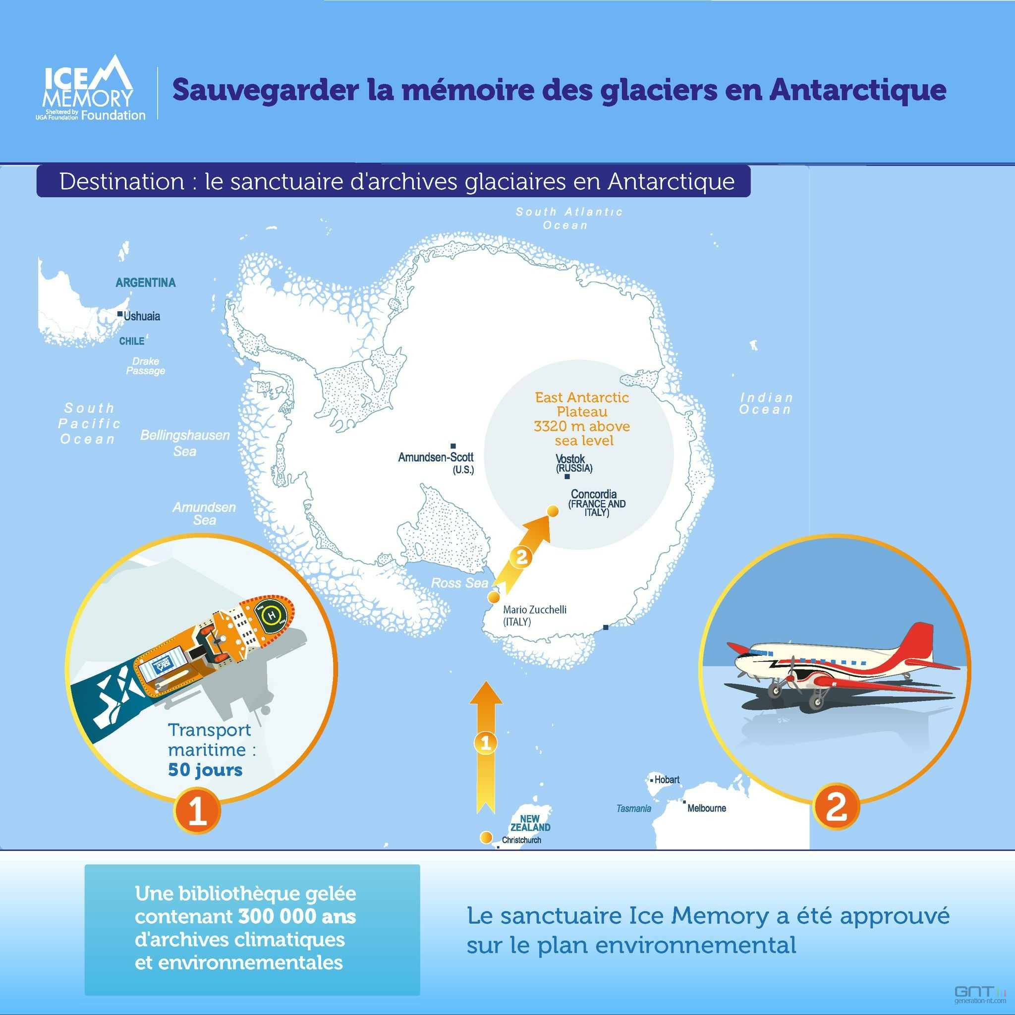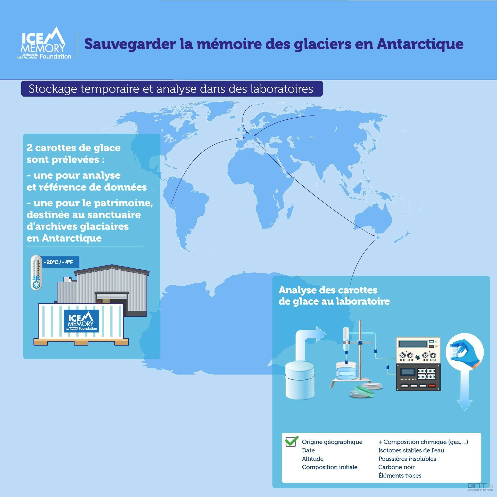 Le processus est mondial : des expéditions internationales sont menées sur les glaciers les plus emblématiques et menacés, du Mont-Blanc à l'Illimani en Bolivie, en passant par le Caucase. Une partie des carottes est analysée immédiatement, l'autre est scellée pour devenir des objets de mémoire. Les deux premiers échantillons, pesant 1,7 tonne, ont accompli un voyage de cinquante jours à bord du navire de recherche Laura Bassi pour atteindre leur nouvelle demeure.
