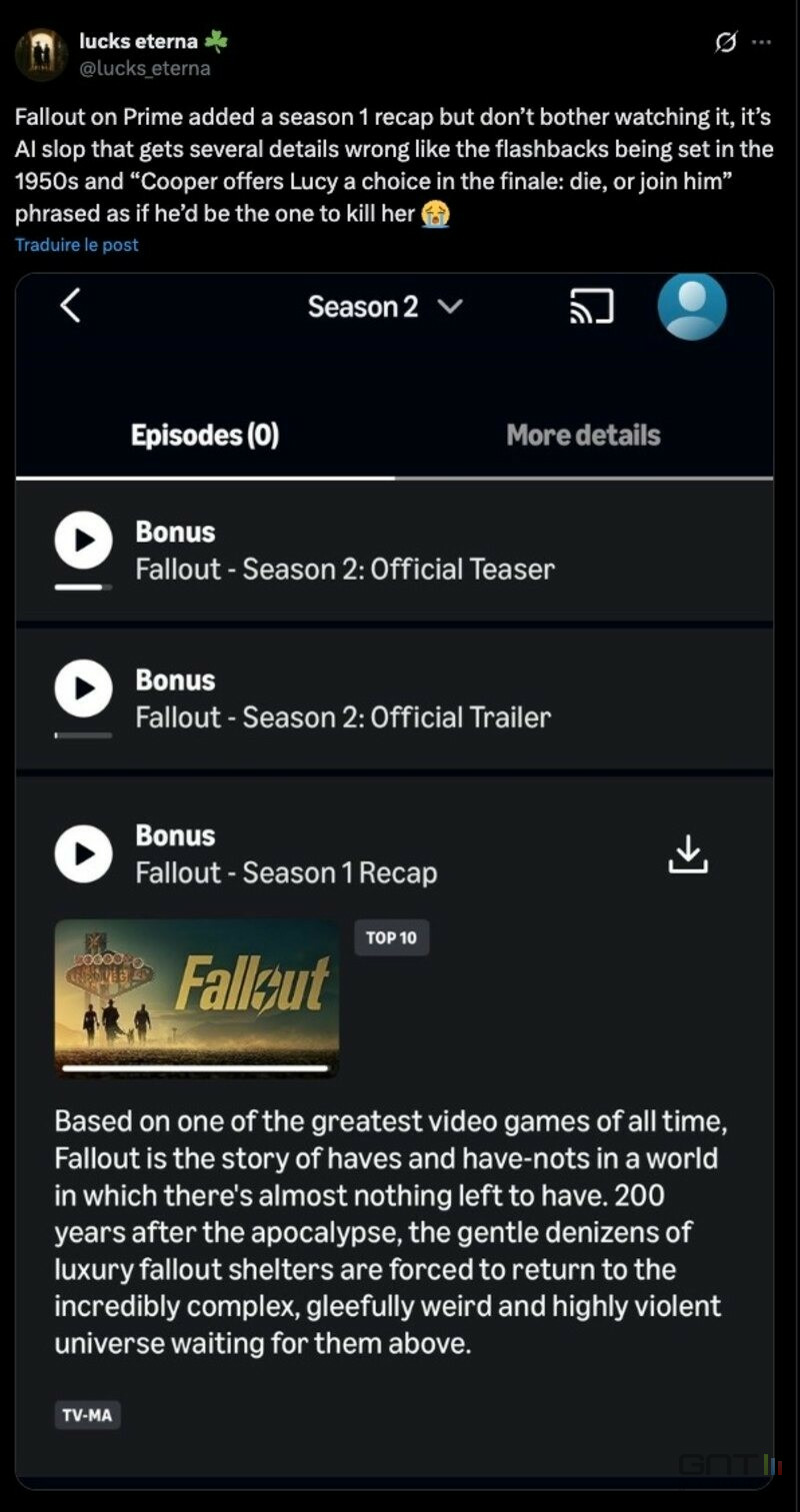 Le résumé généré affirmait sans sourciller que les flashbacks du personnage de "La Goule" se déroulaient dans les années 1950. C'est une erreur monumentale pour quiconque connaît la franchise : l'univers de Fallout possède certes une esthétique rétro marquée, mais les événements pré-apocalyptiques se situent bel et bien en 2077. L'outil, piégé par le style artistique "atompunk", a totalement échoué à contextualiser les images, servant une contre-vérité narrative à des millions de spectateurs.