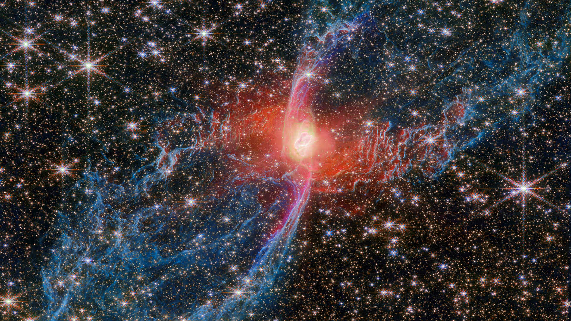 Le télescope spatial James Webb livre une nouvelle image saisissante, celle de la nébuleuse de l'Araignée Rouge, alias NGC 6537 et dont l'étoile centrale est une naine blanche.
